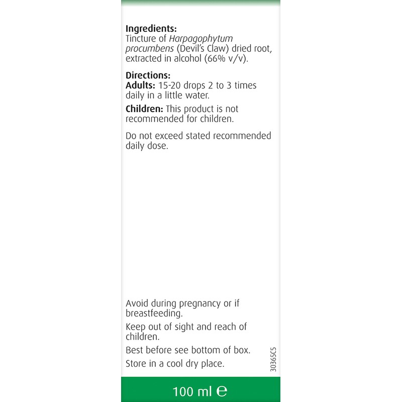 Product descriptionDevil's Claw Harpagophyum Drops A tincture of Devil's Claw (Harpagophytum) cultivated to organic protocol in the Kalahari Desert. Food supplements should not be used as a substitute for a varied and balanced diet and a healthy lifestyle.IngredientsTincture of Harpagophytum procumbens (Devil's Claw) dried root, extracted in alcohol (66% v/v).Legal DisclaimerMust be over 18 years of age to purchase