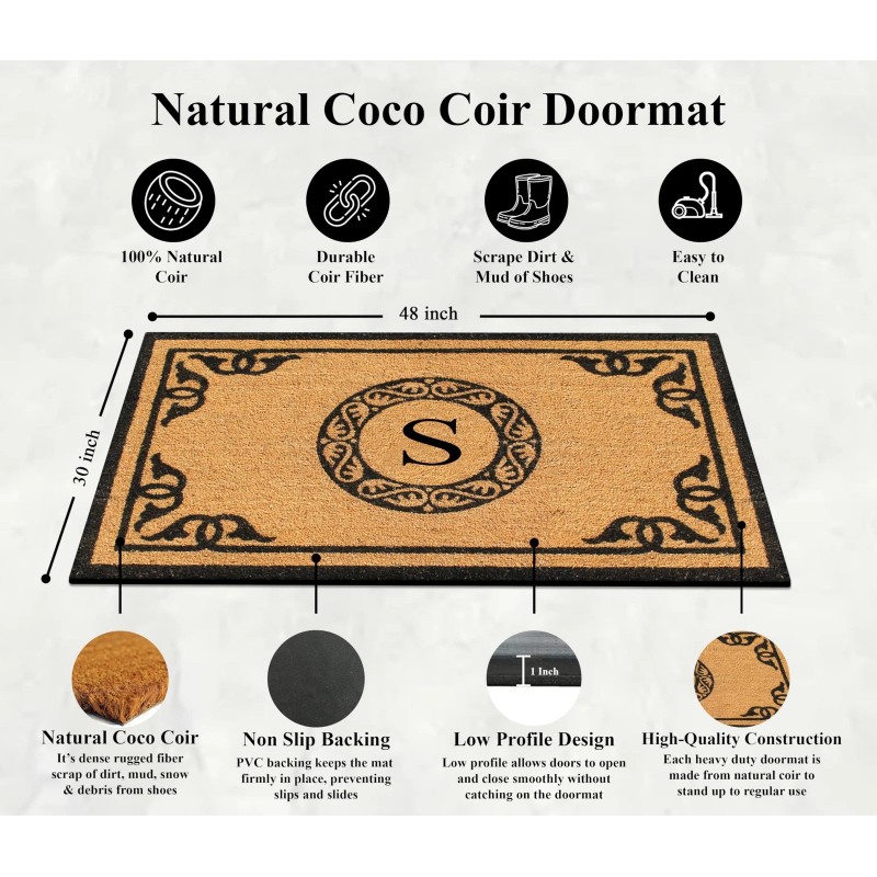 NATURAL COIR PILE MONOGRAMMED FRONT DOOR MAT: This Door mat is made from 100% natural coir fibers which are one of the strongest fibers and they naturally trap dust and other particles. The biodegradable coir fiber material is environmentally friendly and compostable.