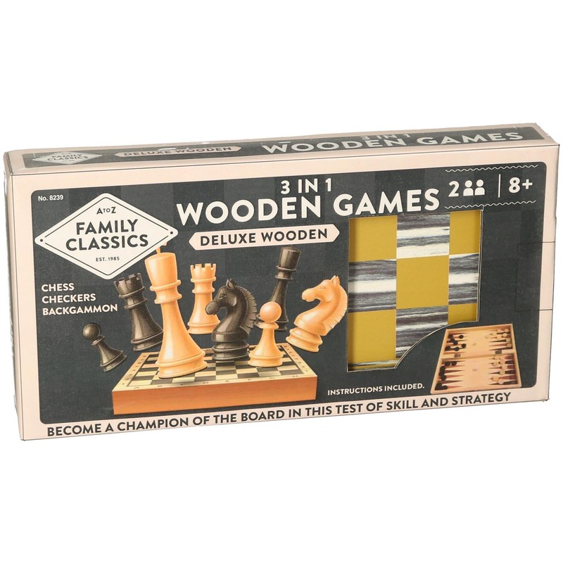 - CLASSIC 3-IN-1 BOARD GAME SET: This deluxe wooden set includes chess, checkers, and backgammon, offering three timeless strategy games in one compact folding case. Perfect for family game nights, travel, or quiet play at home, it provides hours of engaging entertainment while developing logical thinking and concentration.
