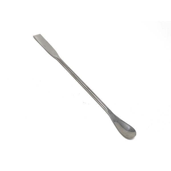 - Spatula with flat square and a spoon end for transferring, lifting, and handling powders and grains.