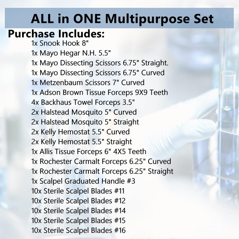 - ✅ ALL in ONE SET of 72 Pcs: This comprehensive set comes with a range of instruments including Kelly Forceps, Mosquito Forceps, Carmalt Forceps, Backhaus Towel Clamp, Mayo Metzenbaum Scissors, Scalpel Handles, Blades and more.