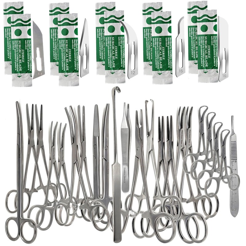 - ✅ ALL in ONE SET of 72 Pcs: This comprehensive set comes with a range of instruments including Kelly Forceps, Mosquito Forceps, Carmalt Forceps, Backhaus Towel Clamp, Mayo Metzenbaum Scissors, Scalpel Handles, Blades and more.