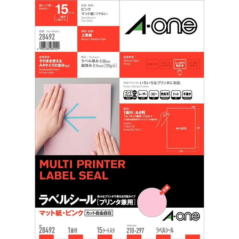 エーワン ラベルシール ピンク A4 ノーカット 15シート 28492