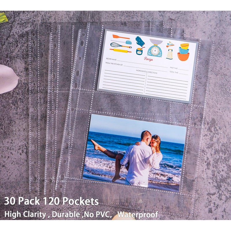- 1, A4 3 Ring Binder Recipe Card Holder: Our recipe album contains a A4 3 ring binder folder and 30 pack sheet protector sleeves pages. You can put total 4 Pcs 4x6 recipe card in both sides in both sides of the sheet. The recipe card collecting holder has 120 capacities
