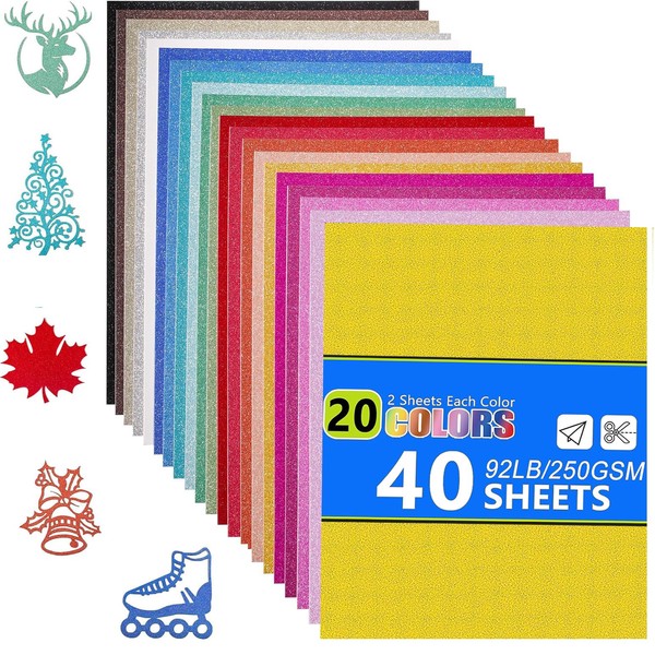 - Glitter Cardstock 40 Sheets: Super Value Pack - This pack includes 40 sheets of multicolored glitter cardstock paper, each color contains two sheets of cardstock, size 8.5 x 11 inch, 250 gsm/92 lb colored cardstock is bright and colorful. One side glitter, backing paper is white