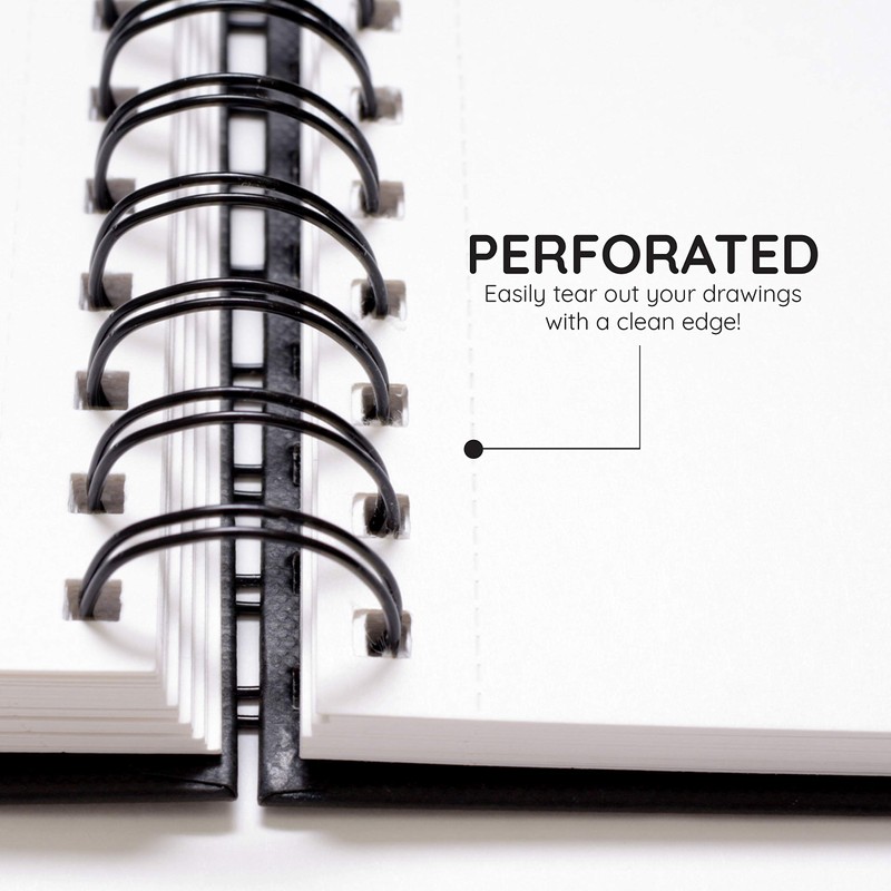 - PERFORATED EASY TO TEAR PAGES: Because the A4 Sketchbook has perforated pages you'll be able to easily remove pages do you never have to suffer any rips or tears to the pages of your artwork. That's great for you because now you can share your artistic talent with everyone! The Wire-O binding keeps pages neat and can hold up to normal wear & tear as well as last you longer without worrying about it falling apart!