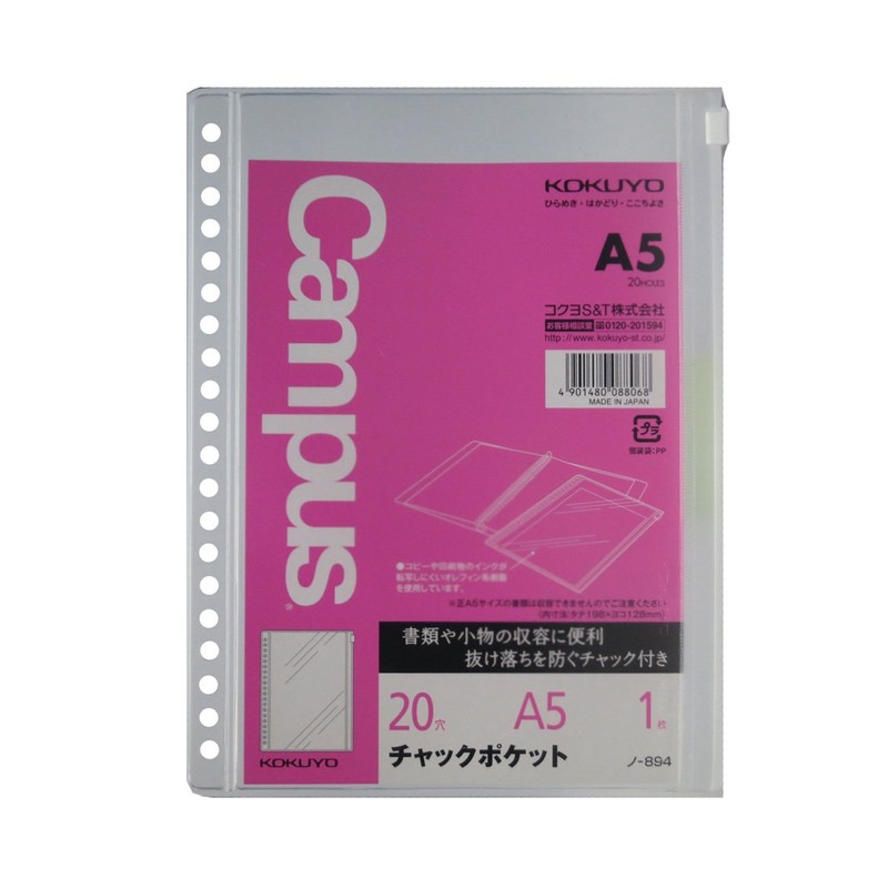 コクヨ キャンパス チャックポケット バインダー ルーズリーフ用 A5 20穴 1枚 ノ-894