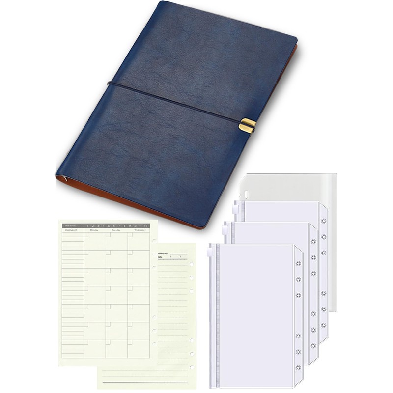 A5 6 Holes PU Leather System Organizer with Rubber Closure Refill with Zipper Bag Notebook Binder Notebook Cover A5 Size Notepad Business Notebook Loose Leaf Notebook (Blue)
