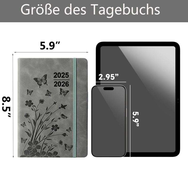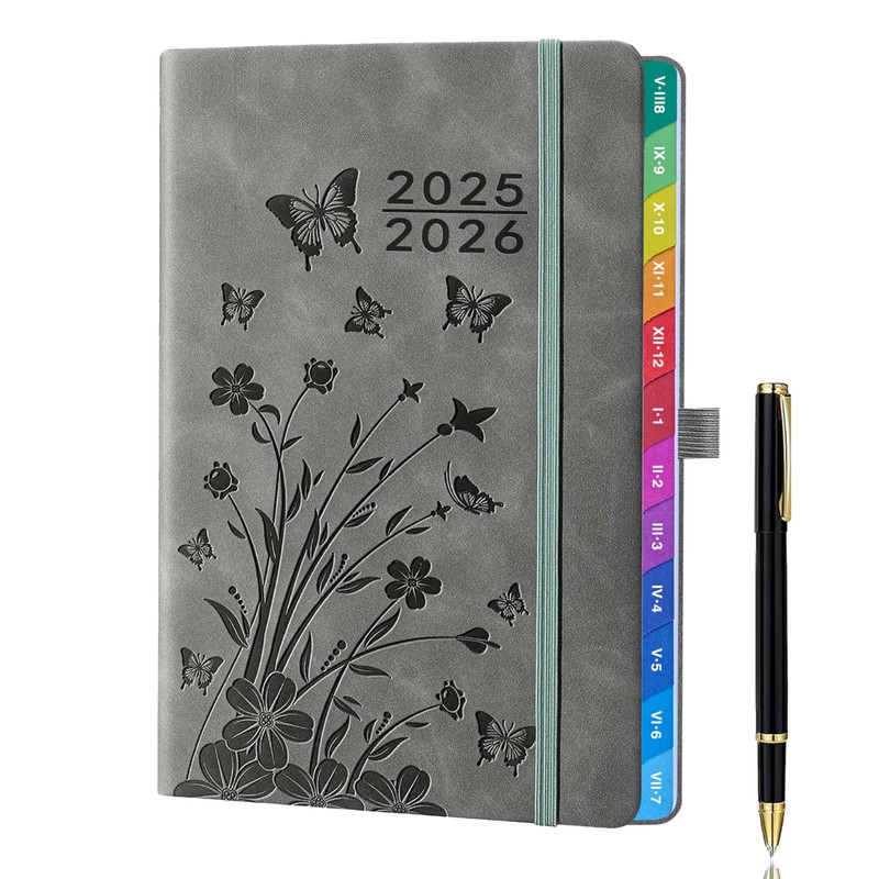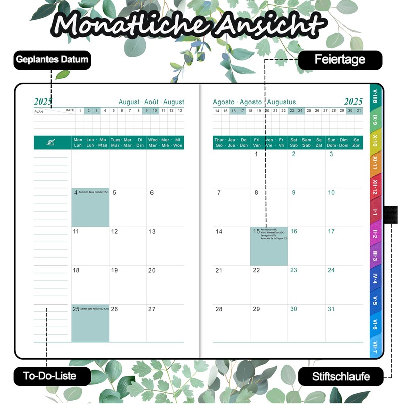- Calendar 2025/2026 A5 - Multilingual weekly and appointment planner: plan efficiently in six languages - including German. Equipped with monthly tabs, practical inner pocket, elastic closure and pen holder. Stylish PU leather hard cover and high-quality 100 GSM paper - ink-proof and suitable for everyday use for school, office and home.