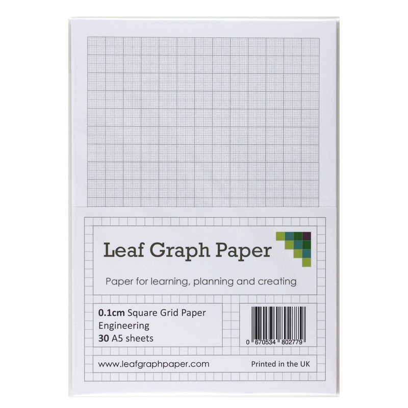 A5 graph paper 1mm or 0.1cm squared in a pack of 30 loose-leaf sheets with grey grid lines. The paper is engineering style with bolder lines every 5mm and 10mm. Designed and printed in the United Kingdom using high quality 80gsm paper from sustainable sources, and from paper mills that meet strict environmental standards.