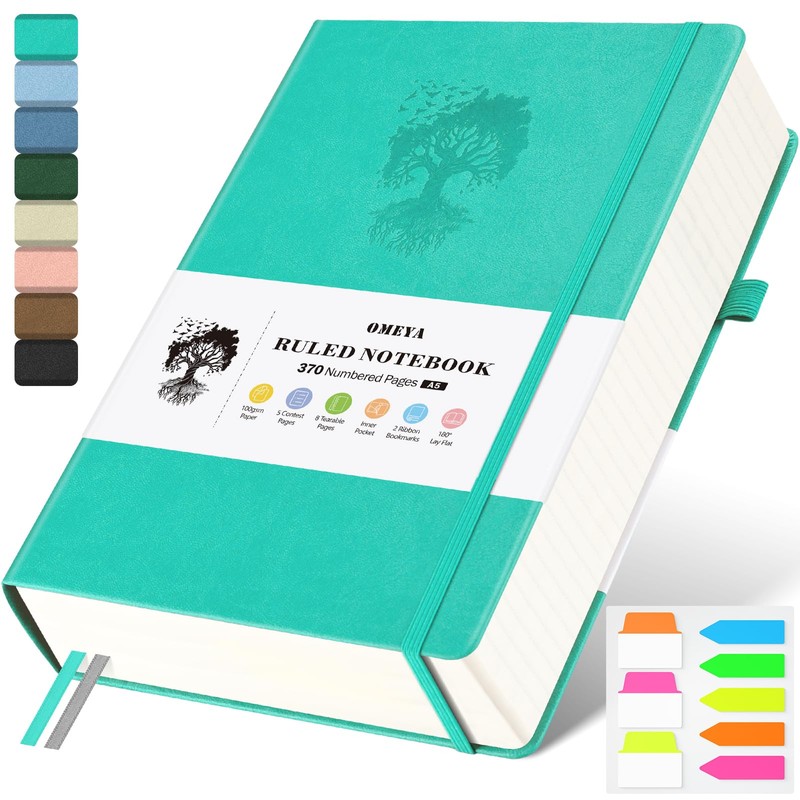 - 【Thoughtful Accessories】Our hard cover notebook comes with a variety of practical accessories to make your daily writing experience more convenient. The leather notebook includes 1 pocket, 2 bookmark ribbons, 1 elastic band, 1 pen loop and 8 perforated pages. And as a bonus, each a5 notebook comes with 160 PCS colorful index & tabs stickers.