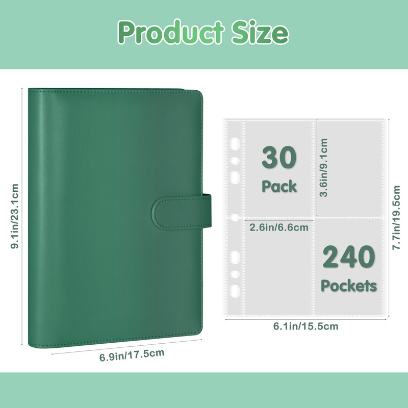 A5 Photocard Holder and Binder, PU Leather 6-Ring Album with Magnetic Closure, Includes 30 Pack 4-Pocket Pages for 240 Cards, Card Holder for Kpop, Trading, and ID Cards (Forest Green)