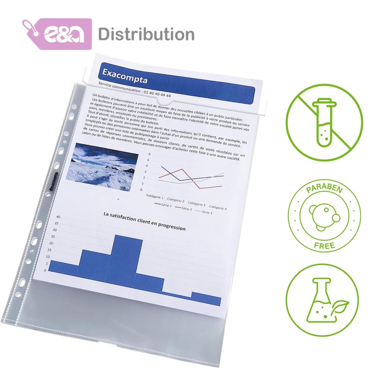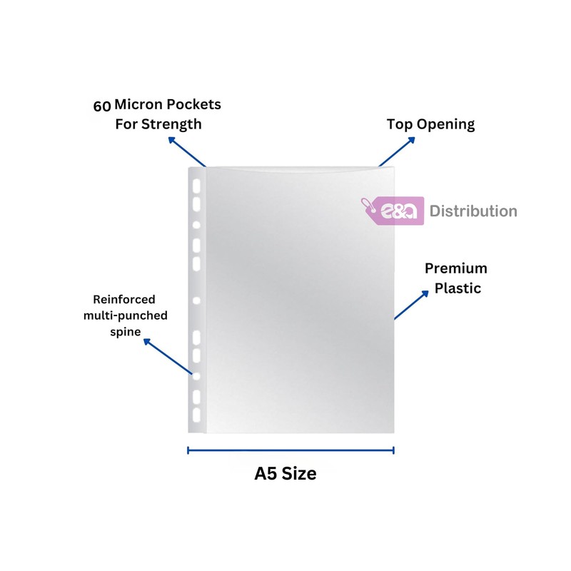 - A5 size office punch pockets. 60-micron glass clear pockets for durability with white reinforcing strip for extra strength. Made from Polypropylene material, acid-free, copy safe and recyclable.