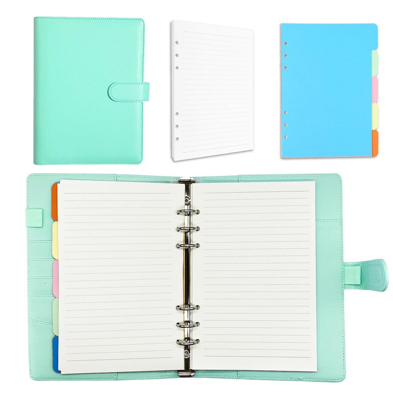 A5 Ring Binder, 6 Ring PU Leather Loose Leaf Notebook Planner Notebook Cover with 45 Sheets A5 Lined Paper, Binder Dividers for School Office Meetings,Green