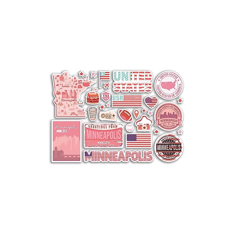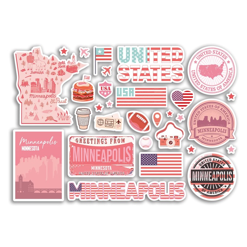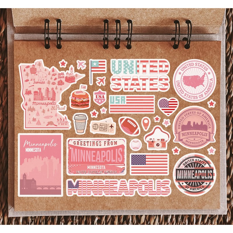 A5 Sticker Sheet Minneapolis Landmarks Vinyl Stickers - Pink Minnesota America USA Flag Travel Holiday Map City Scrapbook Aesthetic #80614