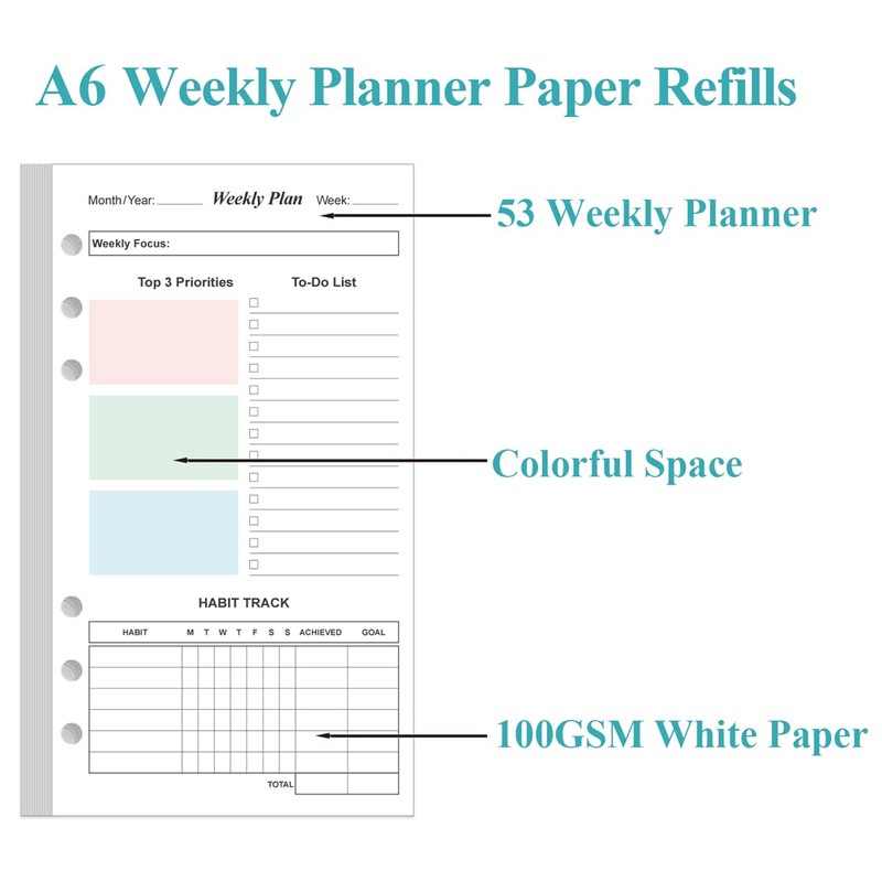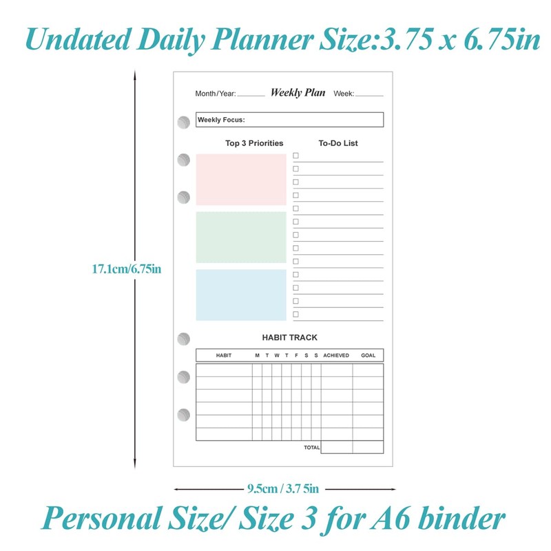 A6 Weekly Planner Refills for Filofax Personal Binders, 53 Sheets/106 Pages Undated Colorful Weekly Planner, 6-Hole Punched, 100 gsm White Paper, Lasts 1 Year, Undated, 3.75" x 6.75"