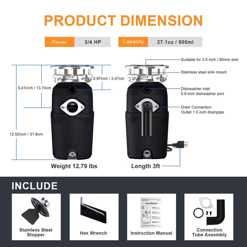 - Compact Design but Powerful: 1/2 Horsepower disposal is suitable for families with 2-4 people, 6.01*6.01*12.52 inch size can save more sink space, comes with a 3ft power cord, standard 0.9 inch dishwasher port.