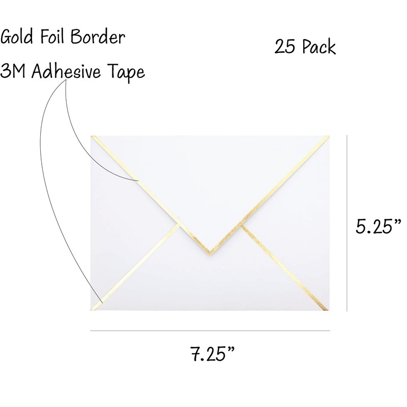 A7 Envelopes - V Flap Foil Border Luxury Mailing Envelopes for 5" x 7" Cards - for Wedding, Invitations, Baby Shower, Photos, Graduation, Birthday, Bridal Shower - 5.25" x 7.25" (White, 25 Pack)