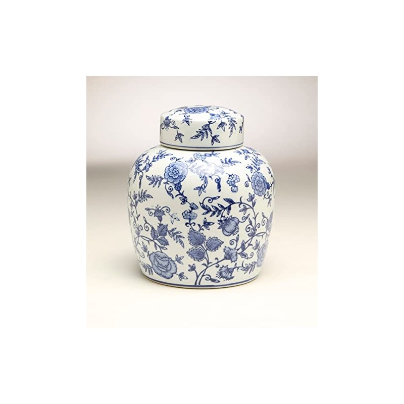 Elevate your home decor with our exquisite 9-Inch Blue & White Ceramic Ginger Jar, a timeless piece that effortlessly combines classic beauty and versatile functionality. Crafted from high-quality blue and white transferware porcelain, this jar boasts a delicate flower and leaf design that adds a touch of elegance to any setting. Standing at a graceful 9 inches, it's a versatile decorative element that can grace your shelves, tables, or mantels with ease. The removable lid enhances its versatility, allowing you to use it for storage or display as a captivating piece of art. The serene blue and white color palette has universal appeal, making it a perfect fit for a variety of decor styles, from traditional to modern. Its intricate floral pattern brings an everlasting charm to your living room, dining area, or bedroom. Measuring 8 x 8 x 9.5 inches, this ginger jar is the ideal fusion of size and visual impact. It embodies the essence of refined decor and makes for a thoughtful gift or a cherished addition to your own home. Add a touch of timeless beauty to your living space with our 9-Inch Blue & White Ceramic Ginger Jar, where the allure of blue and white meets the grace of flowers and leaves, creating an enchanting piece that transforms any room into a sanctuary of style and sophistication.
