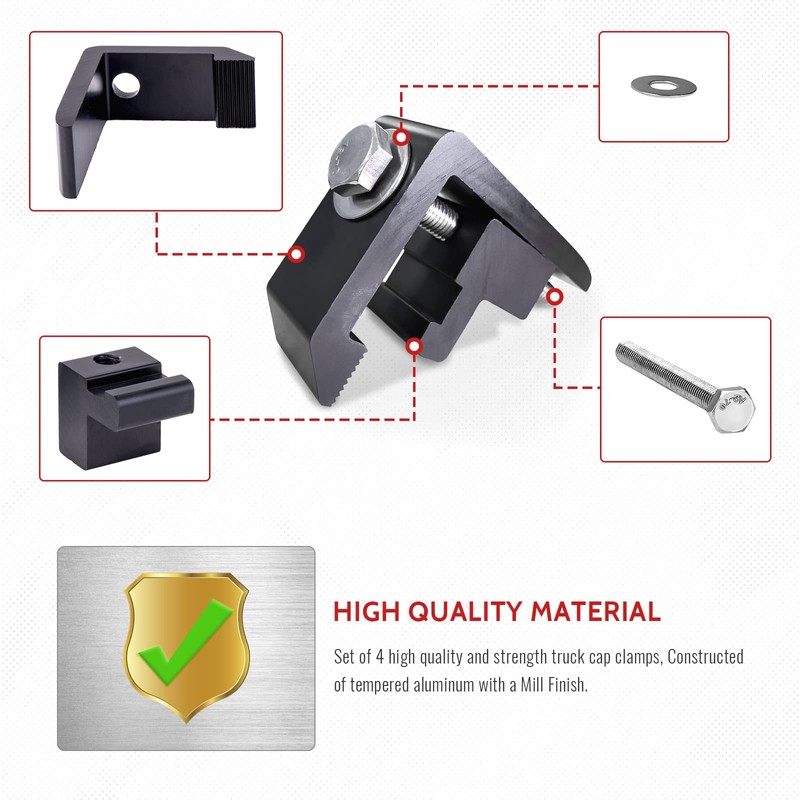 - Set of 4 high quality and strength truck cap clamps, Constructed of tempered aluminum with a Mill Finish