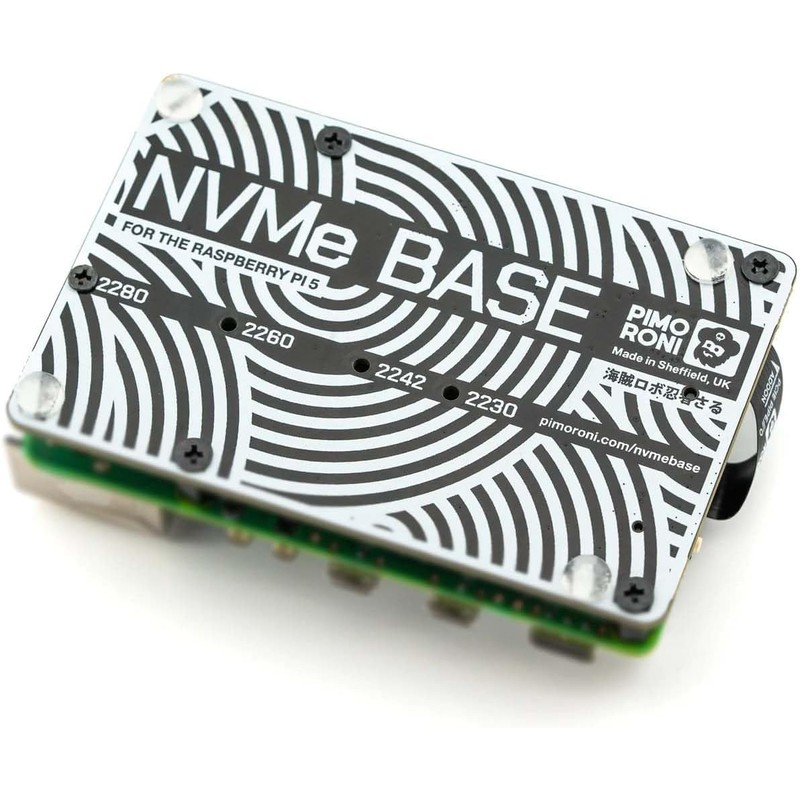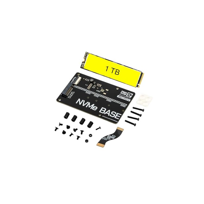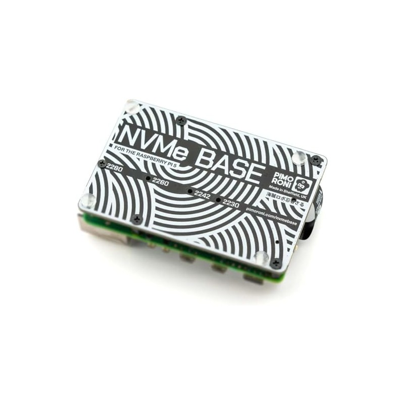 NVMe Base is a PCIe extension board for Raspberry Pi 5. Simply populate it with an M-key NVMe SSD (2230 to 2280 sizes supported) and mount it under your Pi for a compact and fast storage solution - It even comes with rubber feet!