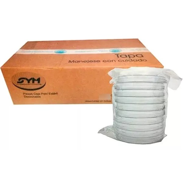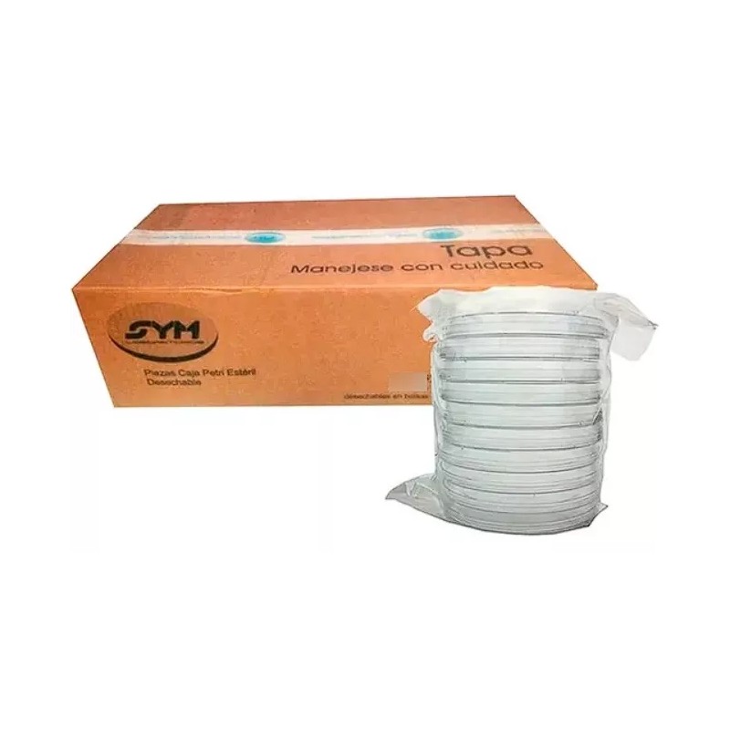 Caja con 400 placas Petri estériles desechables con dimensiones de 60x15 mm, fabricada con poliestireno cristal grado médico, en paquetes de 10 piezas cada bolsa (total 40 bolsas). Indispensable para la propagación de microorganismos en medios superficiales (agar).