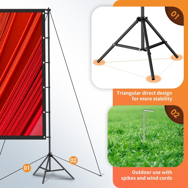 - Note: The screen and stand can be used separately. For outdoor use, secure with windproof ropes to prevent it from being blown down