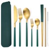 AARAINBOW 6 Pieces Stainless Steel Flatware Set Portable Reusable Cutlery Set Travel Utensils Set Including Chopsticks Knife Fork Spoon Straws Cleaning Brush Dishwasher Safe (B-Green golden)