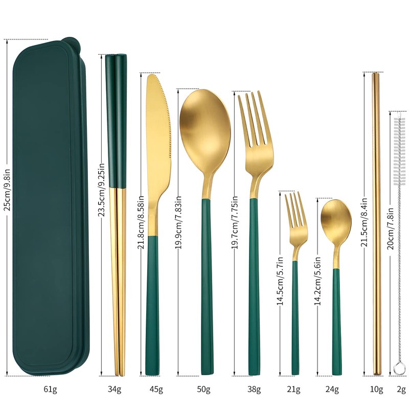 - ✔️8-Piece Reusable Utensils with case:includes 1 x dinner knife,1 x dinner fork, 1 x dinner spoon, 1 x fruit fork,1 x coffee spoon, 1 pair of chopsticks, 1 x straight straw, 1 x straw brush, packing with a beautiful cotton bag, then was put in a gift box.