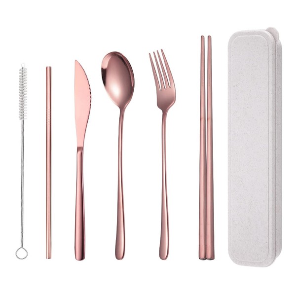 AARAINBOW - Juego de cubiertos de acero inoxidable 18/8 de 6 piezas, portátil, reutilizable, juego de utensilios de viaje, incluye palillos, cuchillos, tenedores, cucharas, pajitas, cepillo para polvo