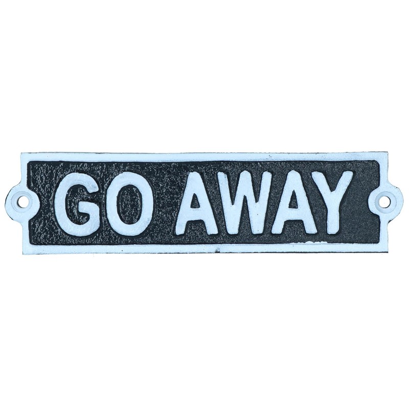 This cast iron sign bears a no-nonsense "Go Away" message in crisp white raised lettering against a black background.