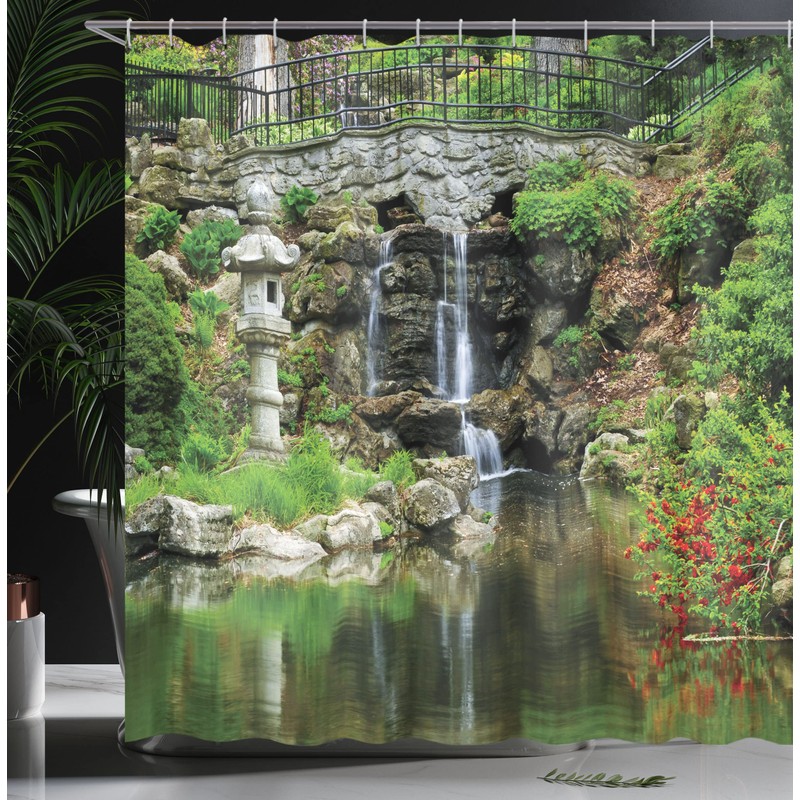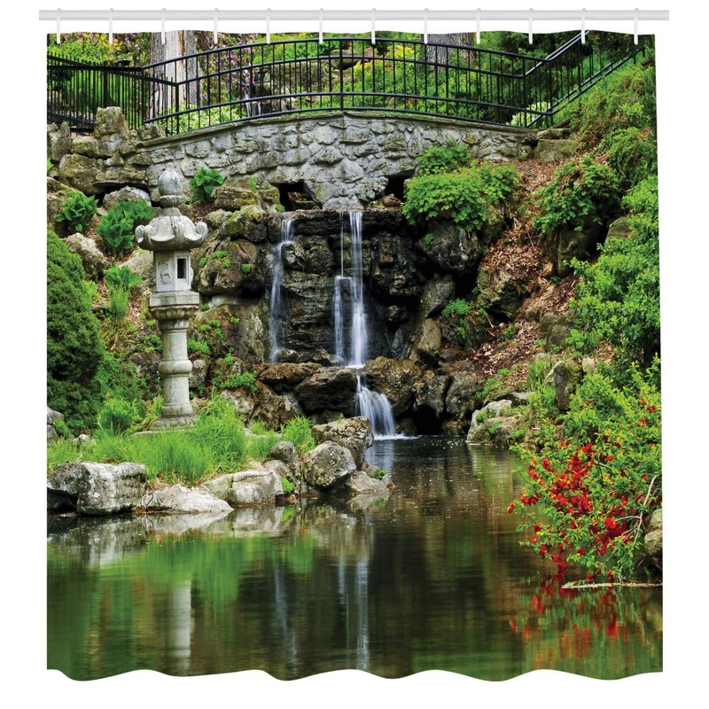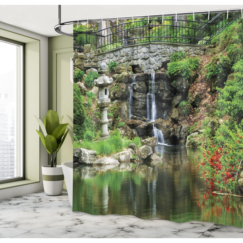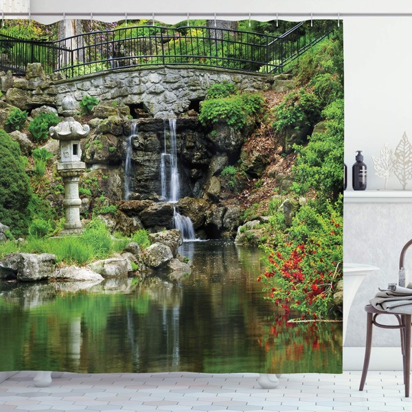 ABAKUHAUS Japanese Shower Curtain, Cascading Waterfall Pond Under Bridge Reflections of Flowers in Water Pattern, Cloth Fabric Bathroom Decor Set with Hooks, 78 Inches, Green White