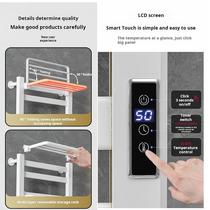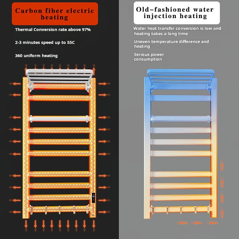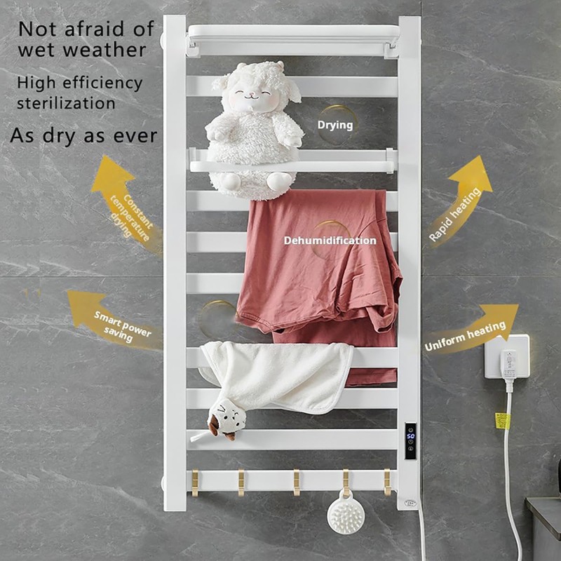 - 【Waterproof and no electric shock】: This heated towel rack for bathroom has been treated for waterproof and no electric shock, so there is no need to worry about the product being corroded by water or getting an electric shock. Use it with confidence.