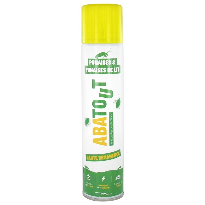 Abatout Bugs Bed Bugs Lacquer 300ml is a lightning bolt that kills bugs and bedbugs. Photostable and concentrated, it is especially designed to destroy insects of the family of pentatomes (bugs). Because of its important shock effect, it quickly kills those that have been sprayed by the product. Thanks to its very high persistence (up to 8 months), it also allows to treat the places where the insects take refuge and thus to obtain their destruction in time.
