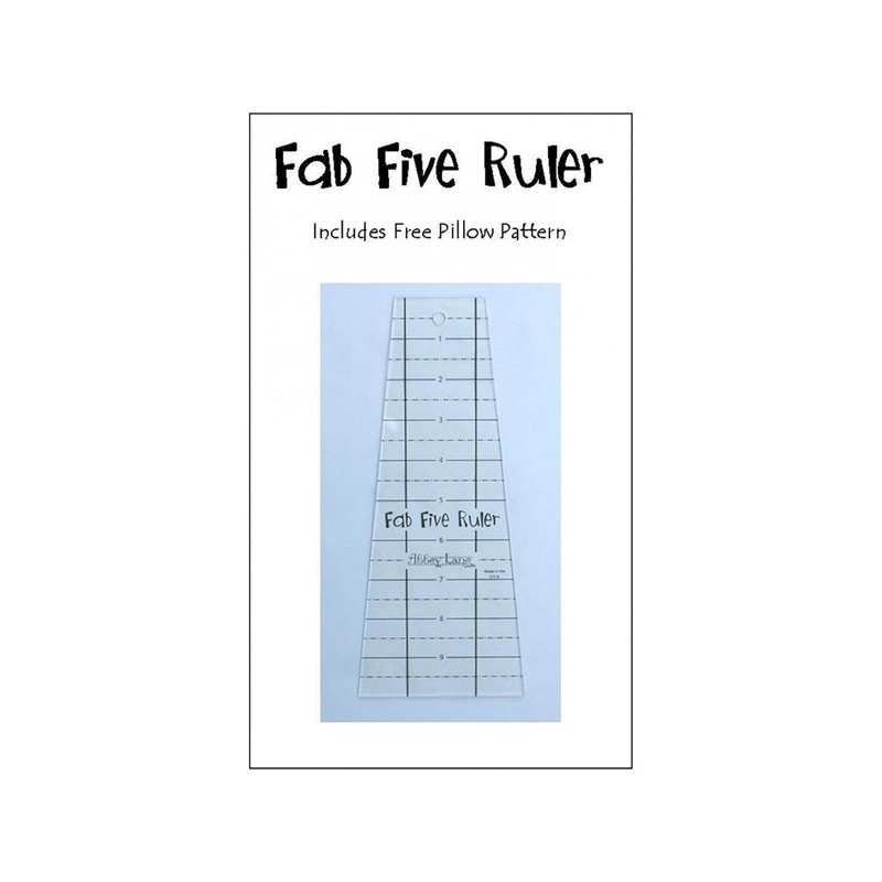 - Abbey Lane Quilts ruler fab five- clear Acrylic ruler is marked in black with Solid inch lines, dashed half-inch lines, with 2 vertical lines, 1.75Apart