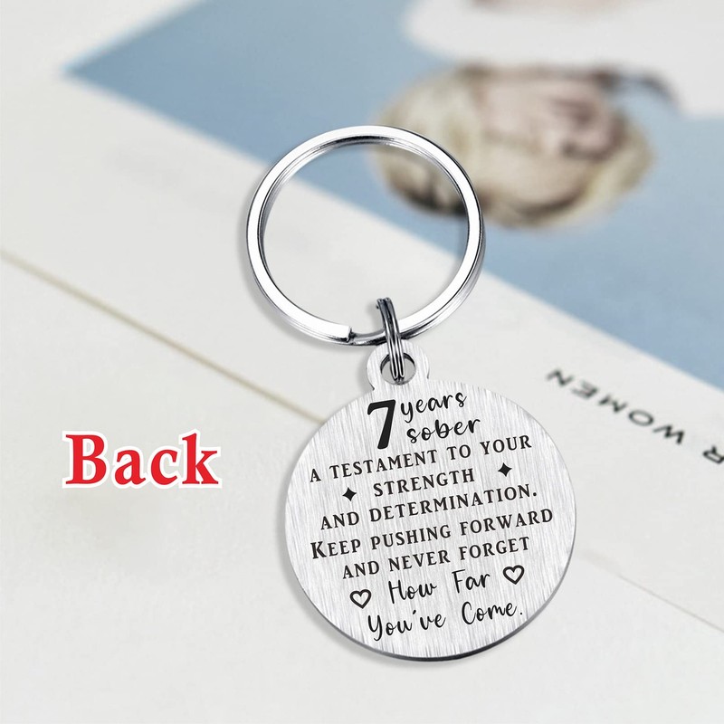 - 7 Years Sobriety Keychain, The back of the pendant is engraved with "7 years sober - a testament to your strength and determination. Keep pushing forward and never forget how far you've come." This message acknowledges the challenges you've faced and offers motivation to continue on the path to recovery.