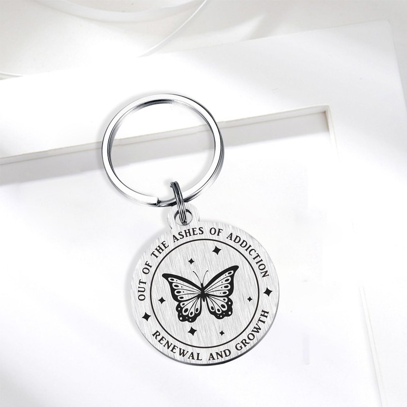 - 7 Years Sobriety Chip, Featuring a pendant with a 1.4-inch diameter and a key ring with a 1.2-inch diameter, this keychain showcases a beautiful butterfly design and the phrase "Out of the ashes of addiction, renewal and growth" on the front, symbolizing your transformation and progress.