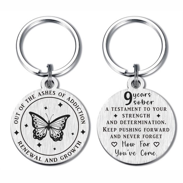 - 9 Years Sobriety Gifts, Our 9 years Sober Keychain is a stylish and meaningful accessory, perfect for commemorating your nine years sobriety milestone. With a beautiful butterfly design, it is a symbol of your transformation, growth, and commitment to recovery.