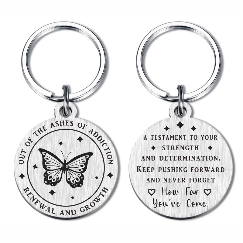 - Sobriety Keychain, Made from durable materials and featuring intricate butterfly details on the front, this keychain is a beautiful and long-lasting reminder of your transformation and growth.