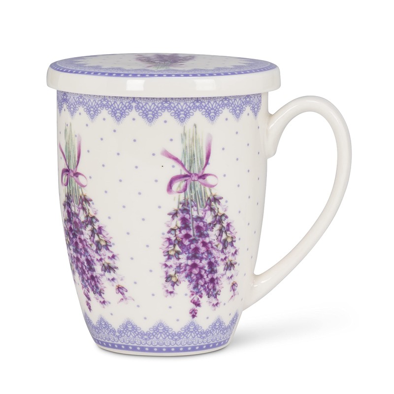 - This tall white mug with matching cover features beautifully painted sprigs of lavender amidst a lovely filigree background pattern — complete with stainless steel for hold loose tea leaves — for an elegant way to brew the perfect morning or afternoon cup