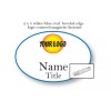 ABC BADGES AND BUTTONS 1 OVAL WHITE / BLUE NAME BADGE FULL COLOR LOGO 2 LINES OF PRINT PIN FASTENER