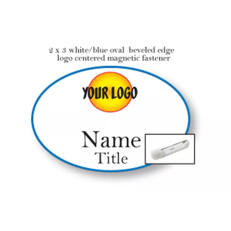 This listing is for a personalized name badge tag with your logo, name and title. Please contact us with your logo. Your badge will arrive with a safety pin fastener on the back. This badge is an OVAL SHAPE WITH A WHITE BACKGROUND WITH A BLUE BEVELED EDGE AND MEASURES APPROX. 2" x 3". These badges are printed in full color with a clear overlay that protects the print for a durable long lasting badge. Your badge will ship within 2 to 3 days. No hidden charges or set up fees. We also carry a premium econo BLANK name badge line for businesses with high turn over employees (these badges can be personalized with crystal clear labels.)Please feel free to contact us with any questions by clicking on contact seller or ask question and we will get back to you as soon as possible.