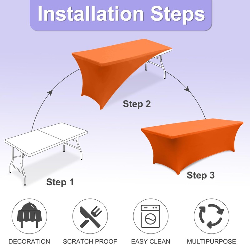 - 2. 【Thoughtful Design】: The 6 foot tablecloth fits tables that are 72"L X 30"W X 30"H. Four-way stretch spandex material and pockets for legs are designed for keeping the tablecloth securely in place to fit your table better and make a flat & professional look so that your table cover won't slip around or billow with wind. It works better and more beautiful than traditional tablecloths. Great for BBQ table in your backyard party
