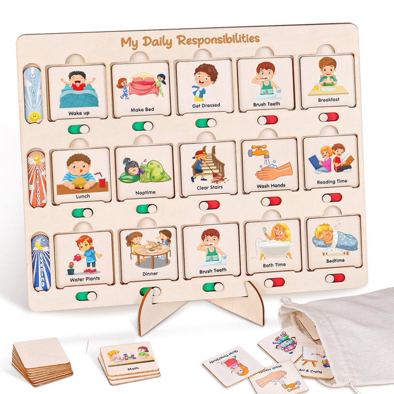 ABCxGOOD Wooden Visual Schedule for Kids Chore Chart, Morning Bedtime Daily Routine Chart for Toddlers, Autism Learning Materials for Homeschool Classroom,76 Wooden Cards.