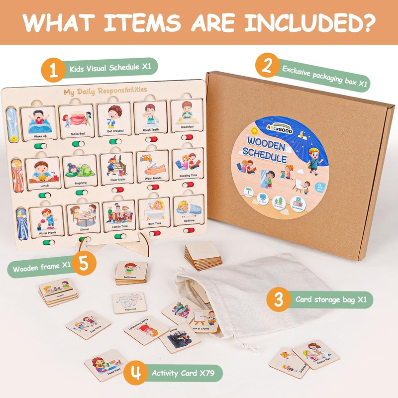 - The set includes: 1 wooden schedule base (size 9.8"×11.8") , 76 activity cards (size 2"×2"), 3 theme cards(morning, afternoon and evening), 1 card storage bag , 1 stand.