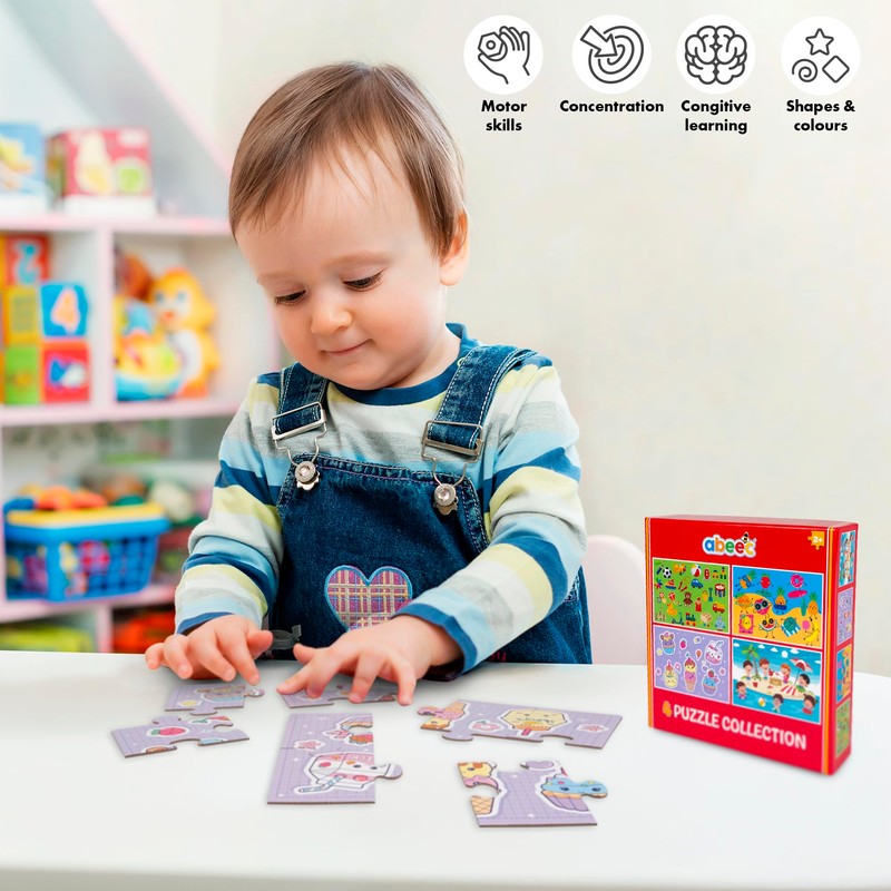 abeec 4 Puzzle Collection - Toddler puzzles - Puzzles for 2 year olds - 4 in a box puzzle collection - Early learning Toys - First Jigsaw Toys, Fruits, Cakes & Ice cream and Beach Scene puzzles