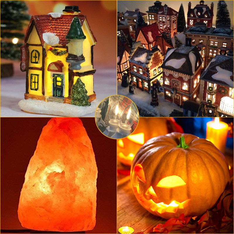 - π¬πππππ πΊπππππ π³π¬π« π©πππ: 0.6 Watt C7 LED bulb, low power consumption and cool to touch, LED bulb lasts longer compared to traditional tungsten lamps. 2700K Warm White Blow Moulded Lights Cord with Clip Bulb, bring great brightness to your ceramic Christmas tree, Christmas house, village house, pumpkin lamps, salt lamps, night lights, cellophane lamps, and holiday decorations
