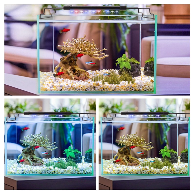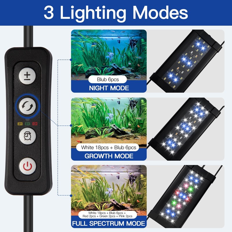 • 【3 Color Light Modes】The aquarium light comes with 3 color light modes.Full spectrum Mode: All lights will turn on (red, blue, green, pink and white LEDs lights).Favorable for water plants to grow up.Growth Mode: White and blue LEDs will turn on.Night Mode.Only blue LEDs will turn on.Make the aquarium fish looks more beautiful in night time.You can choose according to your needs.