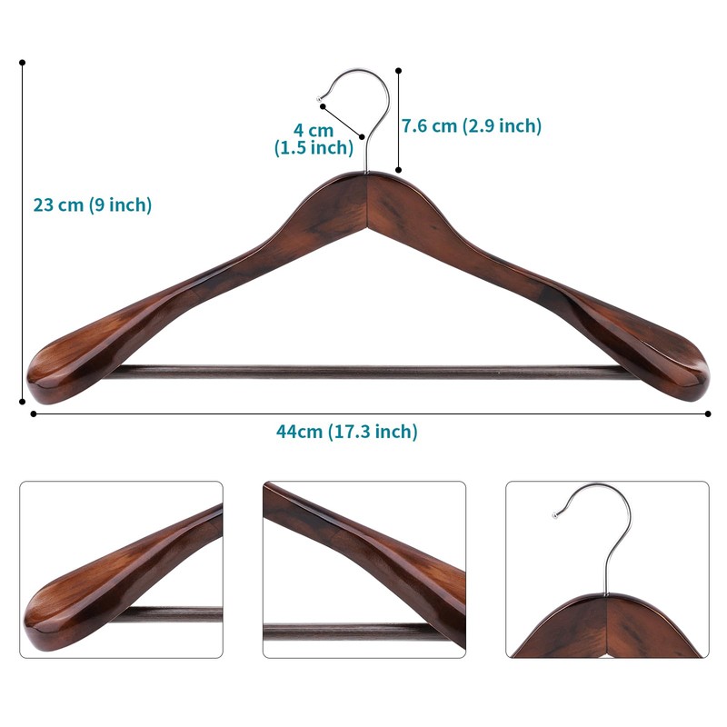 • Exquisite Natural Wood Construction: Meticulously crafted from top - tier Schima - Superba wood, these coat hangers are engineered to handle substantial weight, boasting an impressive load - bearing capacity that ensures they can effortlessly hold even your heaviest winter coats or thick suits. Their long - lasting durability is a testament to the quality of the material, while the smooth, natural finish not only adds a touch of elegance but also makes them ideal for maintaining the integrity of your clothes. Measuring precisely 17.3"W x 9"H, they're perfectly sized to accommodate a diverse range of garments, from delicate blouses to voluminous outerwear