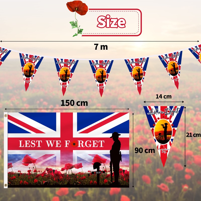 - 🌸GREAT VALUE OF LEST WE FORGET FLAGS : you will get 1 x lest we forget flag with eyelets ( 5ft x 3ft ), 1 x remembrance day bunting ( total length 7m, each flag measures 14 x 21cm ). Wonderful printed remembrance day flags put the sentiment across, remember those who died for us during the World Wars.